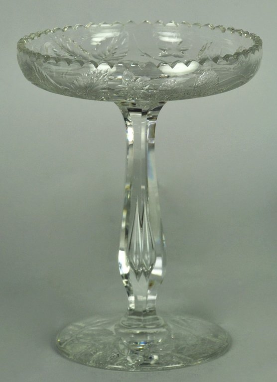 SoldVintage Cut Crystal Pedestal Compote DishVintage Cut Crystal Pedestal Compote Dish. Piece is crafted from clear thick walled crystal and features cut and etched floral design foliage throughout. Teardrop form to the pedestal stem. Scalloped-See Sold Price