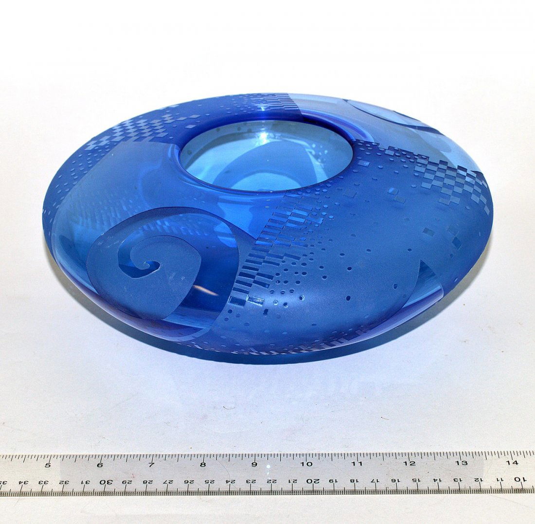 SoldPATRICK WADLEY (ATX 1950-1992) ETCHED GLASS VASESandblasted and etched blue glass vase, signed P. Wadley (Patrick Wadley, American, active in Austin, Texas, 1950-1992), dated [19]89, numbered 8956 underfoot, decorated with dancing figures, approx 1See Sold Price