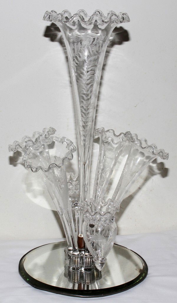 ETCHED GLASS EPERGNE ON MIRRORED BASE,