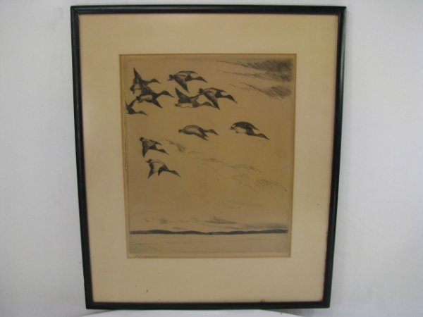 ETCHING DUCKS IN FLIGHT PENCIL SIGNED PC WHARTON