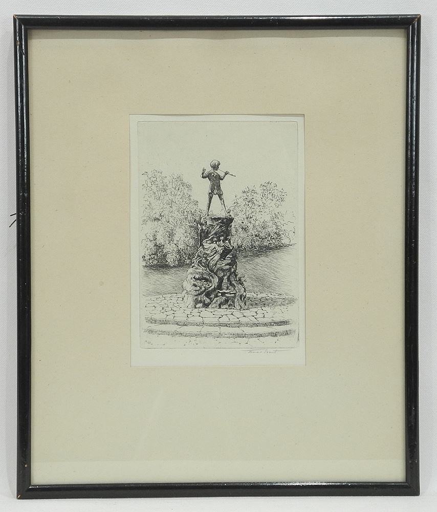 Etching signed James Grant, 6 1/2 x 4 1/2", "Peter Pan in Hyde Park", C.1925.