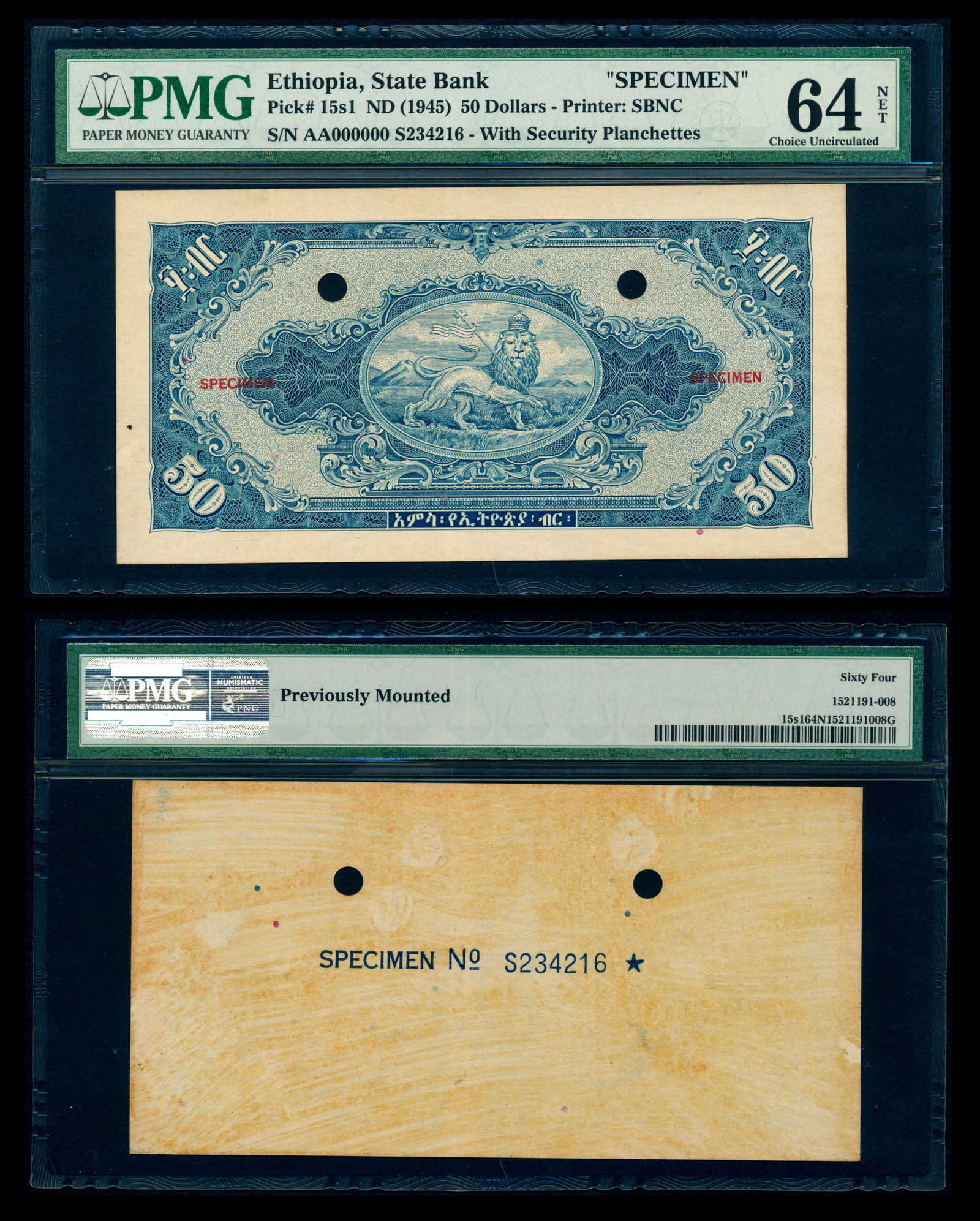 Ethiopia $50 1945 specimen PMG