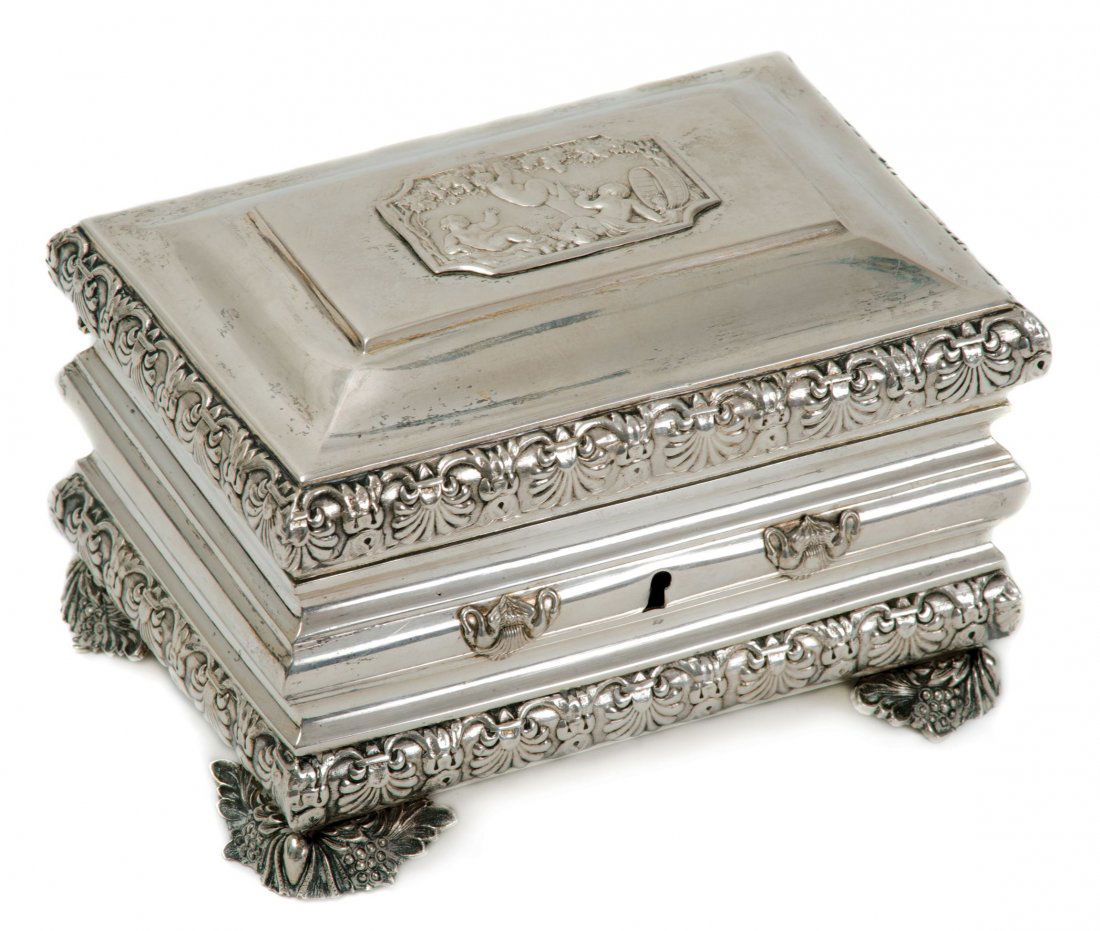 A SILVER 'DRAGON' BOX AND COVER, CHINA, LATE QING DYNASTYMar 11, 2026Vintage Silver Plate Jewelry BoxMar 10, 2026Gorham Rococo Sterling Table Box26 mins LeftSilverplated Dresser BoxMar 04, 2026Italian 925 Sterling Silver Floral Leaf Chased Spice Besamim Box6 days LeftSilver Cigarette Box3 days LeftRussian Silver Cigarette CaseMar 03, 2026Antique Continental Silver Cherub & Insect .863 Fine Silver Trinket Box6 days LeftQajar Silver and Silver-Gilt Cigarette Box, PersiaMar 15, 2026A WMF German Art Nouveau jewelry casket, circa 1905Mar 15, 2026A YEMENI JEWISH SILVER FILIGREE BESAMIM SPICE BOXMar 06, 2026Handmade 925 Sterling Silver Multi Floral Esrog Box 5.5 x 8 Inches7 days LeftHandmade Italian 925 Sterling Silver Floral Leaf Esrog Box4 days Left925 Sterling Silver Handmade Floral Swirl Engraved Esrog BoxMar 02, 2026Antique Russian Silver Cigarette CaseMar 03, 2026Handmade 925 Sterling Silver Floral Snuff Spice Box BP-14395 days Left