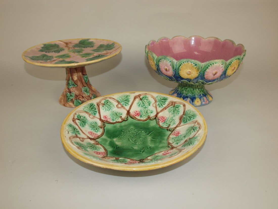 Etruscan Majolica daisy compote, maple leaf cake stand,