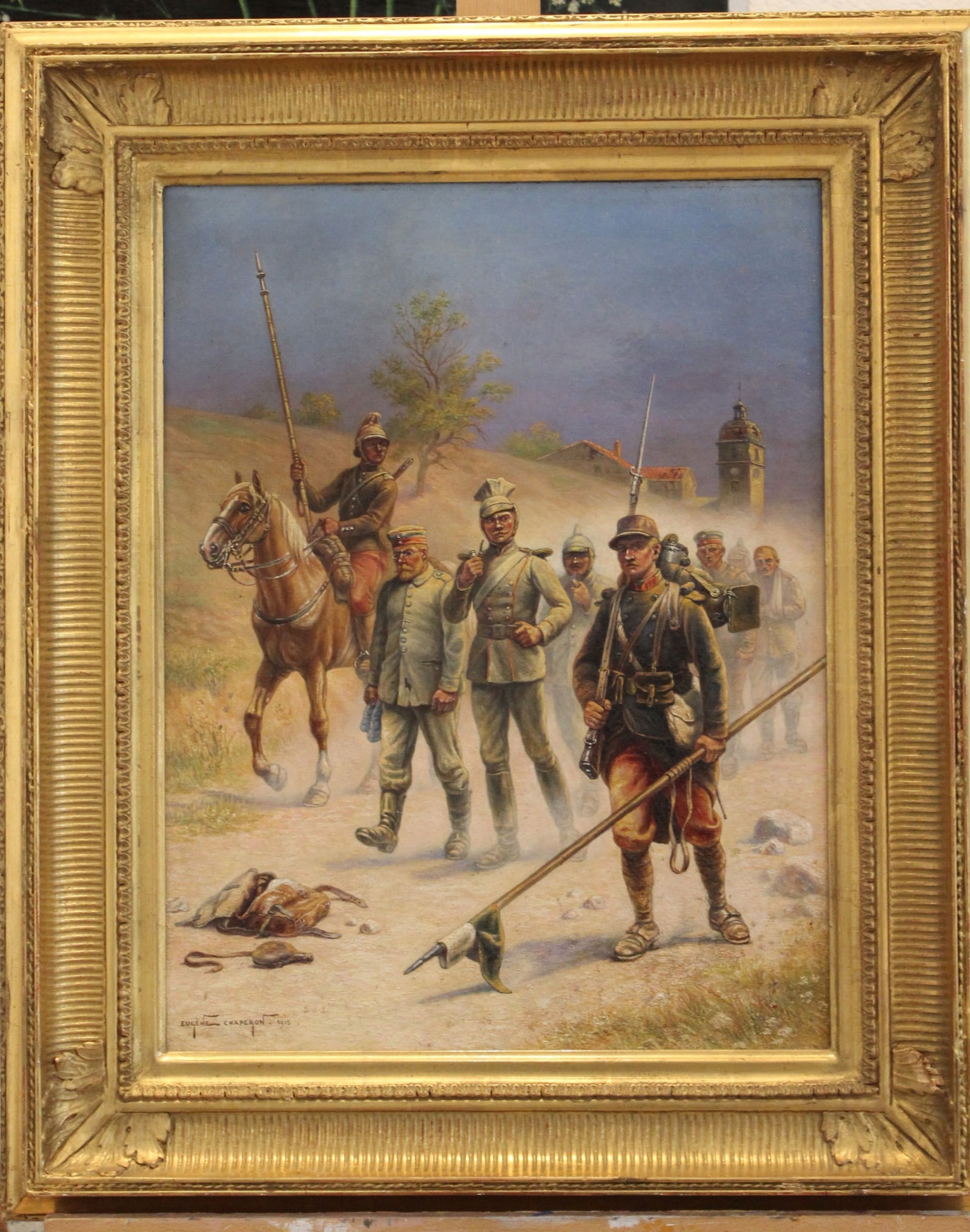 SoldEugene Chaperon "Drummers of the Regiment" OilEugene Chaperon (French, 1857-1938) "Drummers of the Regiment," oil on panel, depicting two military drummers in the battlefield landscape, signed along bottom: "Eugene Chaperon." Image: 10" H x 8" W;See Sold Price
