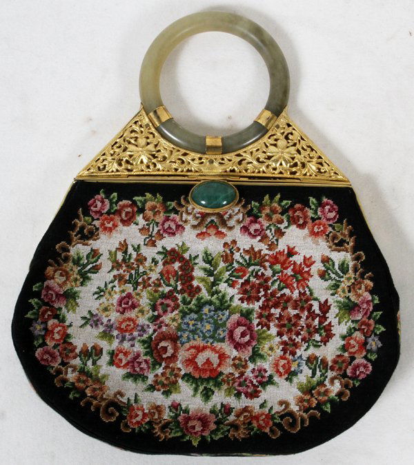 EUROPEAN NEEDLEPOINT PURSE, JADE HANDLE, BUTTON