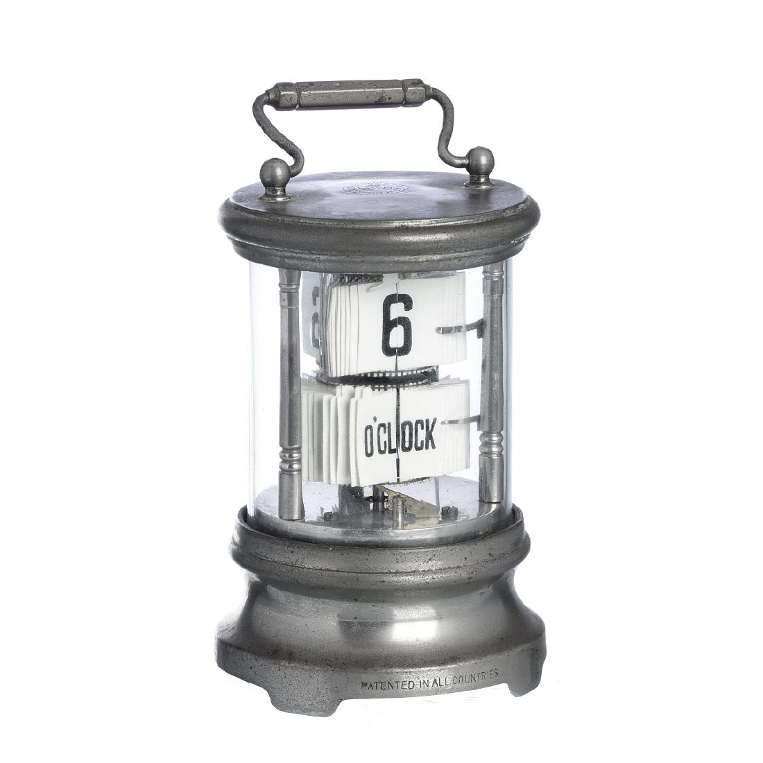 SoldAN EARLY 20TH CENTURY AMERICAN EVER READY CHRONOS DESK CLOCK,AN EARLY 20TH CENTURY AMERICAN EVER READY CHRONOS DESK CLOCK, the glazed cylindrical brass case with swing handle, with ticket-flip Arabic numerals Dimension: 16cm high including handleSee Sold Price