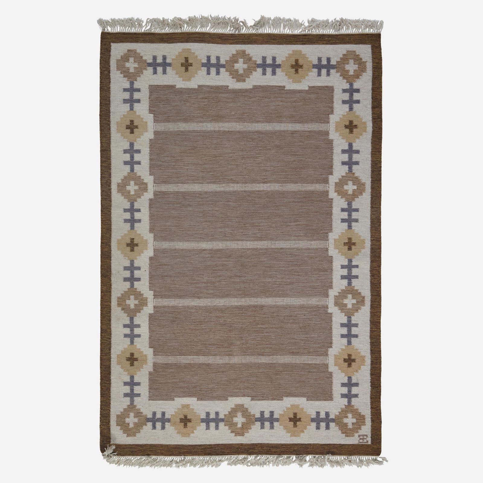 SoldScandinavian, Flatweave carpetScandinavian Flatweave carpet c. 1950hand-woven wool 67.5 w × 108 l in (171 × 274 cm) Woven signature to edge 'B'. This work will ship from Wright in Chicago, ISee Sold Price