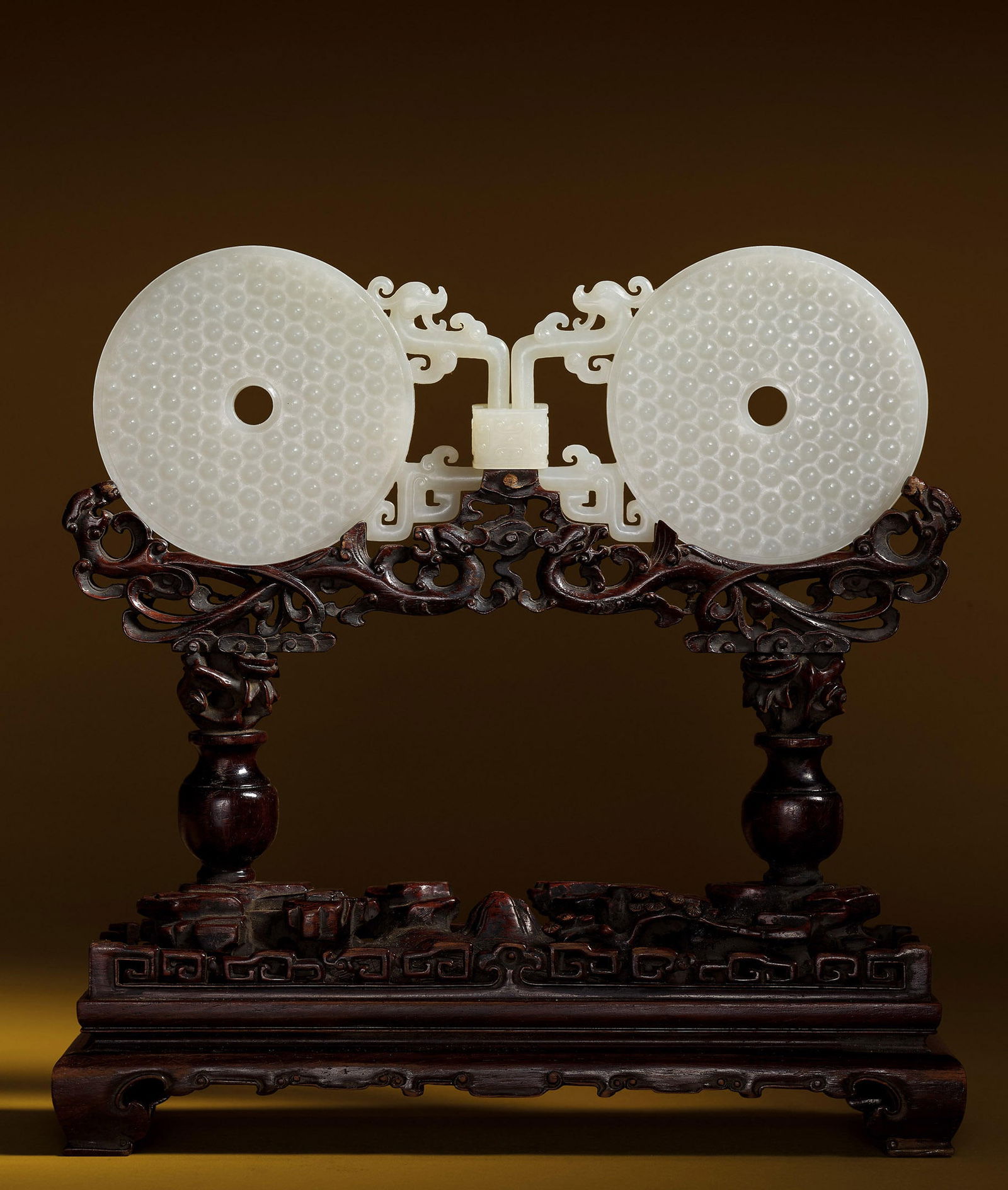 Exceedingly Rare White Jade 'Dragon' Double Bi Disc, 18c.