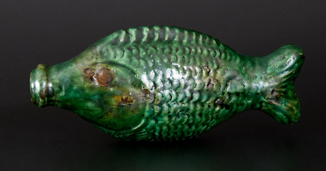Exceptional Green-Glazed Redware Figural Fish Bottle,
