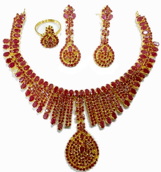 SoldPrecious 22K Gold Ruby Jewelry Suite SetExotic Ruby Necklace & Earring Custom Made Jewelry Suite Set Made of 22K Yellow Gold over Sterling Silver 24.00cts of Rubys (30.00grams) Dimensions: Please see GLA report* * (estimate/approximately)See Sold Price