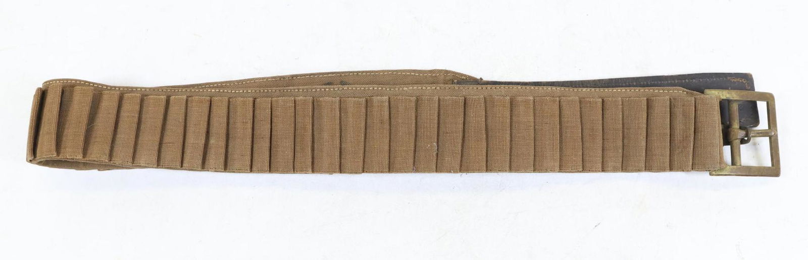 Sold(4) ARMY CARTRIDGE BELTS, WWI ERA(4) Army Cartridge Belts, WWI era: (1) Mills cartridge belt, last patent date July 30, 1907, 10 pockets with eagle snaps, green color; (1) metal without markings, 9 pockets, 1 witSee Sold Price