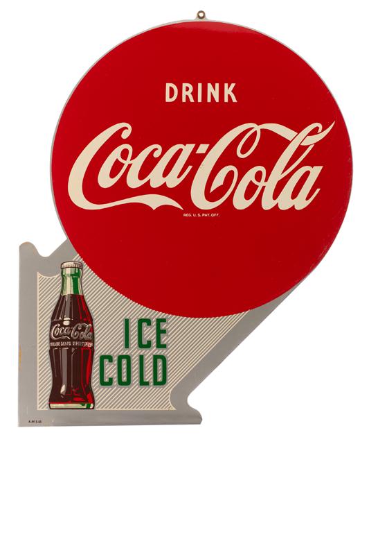 Sold1956 Drink Coca Cola Ice Cold Double Sided Metal Flange SignDrink Coca Cola DSM flange sign with bottle. The sign has bright color and high gloss with surface scratches on both sides. One side has a heavy .5' scratch on the bottom center of the button. MarkedSee Sold Price