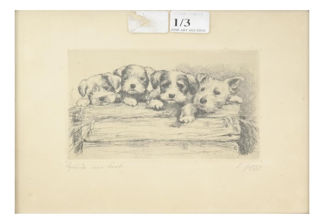 F. Biber "Four Dogs On A Log" Etching