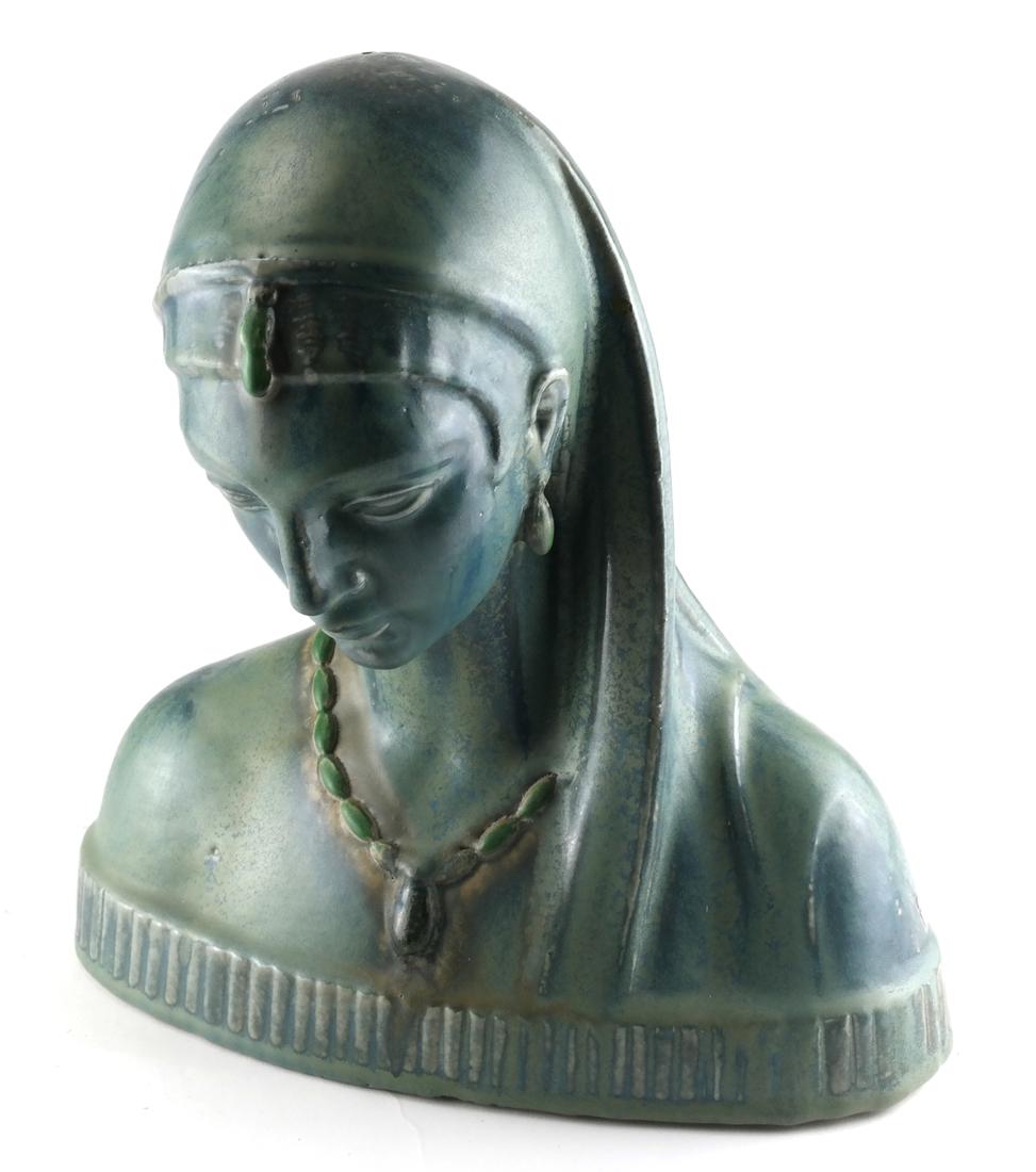 SoldART NOUVEAU CERAMIC BUST OF MAIDEN C. 1915An Art Nouveau ceramic bust of a maiden having gold painted accents circa 1915. Inscribed "Granitex" on base. Ht: 21" Wd: 11.5" Dpth: 8"See Sold Price