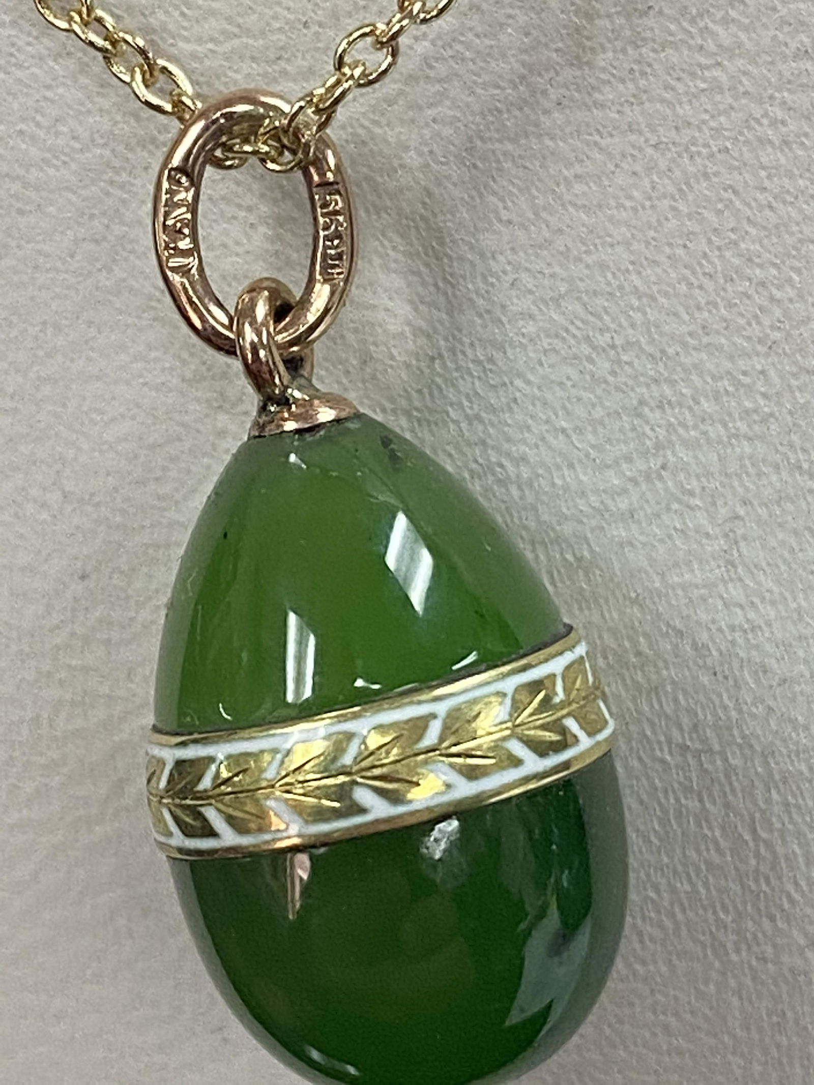 Natural Jade Carved Diamond Pendant 18kt .07ct**Natural Jade Carved Diamond Pendant 18kt**Natural Jade Carved Diamond Pendant 18kt**Faberge - Pendant - 14 kt. Russian Imperial 56K Gold Diamond & Enamel Egg Pendant 1890s21 hrs LeftRUSSIAN GOLD JADE EGG PENDANT w. MALTESE CROSSFeb 07, 2026Faberge - Pendant - 14 kt. Yellow gold, Faberge Imperial Russian 56K (14K) Yellow Gold & Diamond21 hrs LeftRUSSIAN SILVER CLOISONNE ENAMEL EGG PENDANTFeb 07, 2026Faberge Gilt Intaglio Glass Winter Palace Egg Sterling Vermeil Silver BaseFeb 08, 2026Faberge - Pendant - 14 kt. Yellow gold, Faberge Imperial Russian 56 Gold Jeweled Egg Pendant with21 hrs LeftRUSSIAN SILVER CLOISONNE ENAMEL EGG PENDANTFeb 07, 2026Classic Green Egg Pendant with Gold NecklaceJan 21, 2026FABERGE K18 Yellow Gold Easter Egg Diamond Enamel PendantJan 25, 2026Pendant - 14 kt. Yellow gold, Russian Antique 56K (14K) Yellow Gold & Diamond Egg Pendant21 hrs LeftFabergé - Pendant - 14 kt. Antique Fabergé Imperial Russian 56K (14K) Rose Gold Blue Enamel Egg21 hrs LeftFaberge - Pendant - 14 kt. Yellow gold, Faberge Imperial Russian 56K (14K) Yellow and Rose Gold &21 hrs Left14K GOLD PENDANT WITH GREEN JADE STONE 1.7 GRAMSFeb 08, 2026
