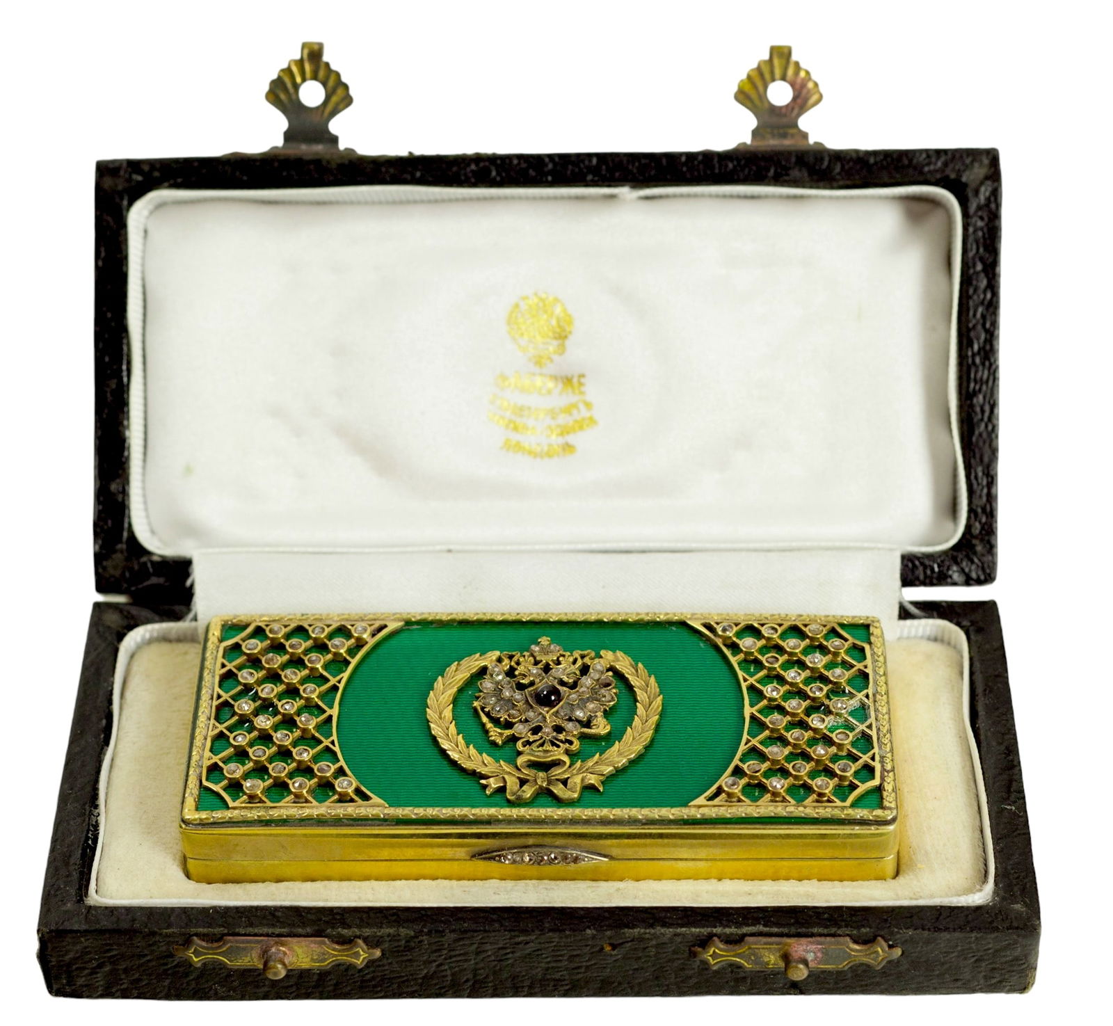 Antique Russian Faberge Era Gold Amethyst Egg Pendant with Diamonds2 days LeftRussian Faberge Era 14K Gold Brooch Pearls Old Minor Diamonds2 days LeftFaberge Era Russian Silver & Guilloche Enamel Kovsch with Imperial coin2 days LeftRUSSIAN SILVER & GUILLOCHE CIGARETTE CASE fr. SOTHEBY'sJan 10, 2026FABERGE - RUSSIAN WOODEN FITTED CASE BOXJan 24, 2026RUSSIAN SALAMANDER SILVER ENAMEL DIAMOND TOBACCO BOX4 days LeftA Fabergé Diamond and Pearl Mounted Opaque enam15 hrs LeftANTIQUE RUSSIAN SILVER ENAMEL CIGARETTE CASEJan 10, 2026FABERGE - SILVER RUSSIAN CIGARETTE CASE fr. SOTHEBY'sJan 10, 2026RUSSIAN IMPERIAL GOLD & SILVER CIGARETTE CASEJan 10, 2026Cartier Art Deco 18K Gold Diamond Jade Jewelry Box4 days LeftFaberge Imperial Gold-Tone Enamel Picture FrameFeb 10, 2026RUSSIAN SILVER ENAMELED BELL PUSH w. DIAMONDSJan 10, 2026Imperial Faberge Green Guilloche Enamel Box3 days LeftA Exquisite Gilt Silver Inlaid Gems Lotus Pattern Phoenix Pattern BoxJan 23, 2026FABERGE - GOLD, SILVER & RUBY RUSSIAN COMPACTJan 10, 2026