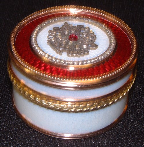 SoldFaberge style miniature pill box, round covered box, stamped and tested “56†14K rose and yellowFaberge style miniature pill box, round covered box, stamped and tested “56” 14K rose and yellow gold with pink enamel in the manner of Faberge, 20th C. Diameter: 1 ¾ inches, HeightSee Sold Price