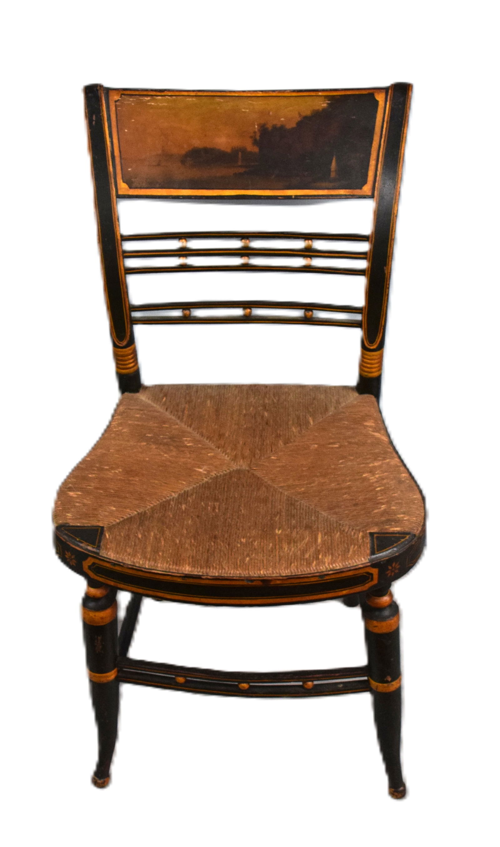 SoldRARE SET OF ELEVEN SHERATON CHAIRSRare set of eleven New York Sheraton fancy chairs with original paint decoration consisting of two arm and nine side chairs, circa 1820, each with rush seats and gilt stencil decoration. Armchair: 33.See Sold Price
