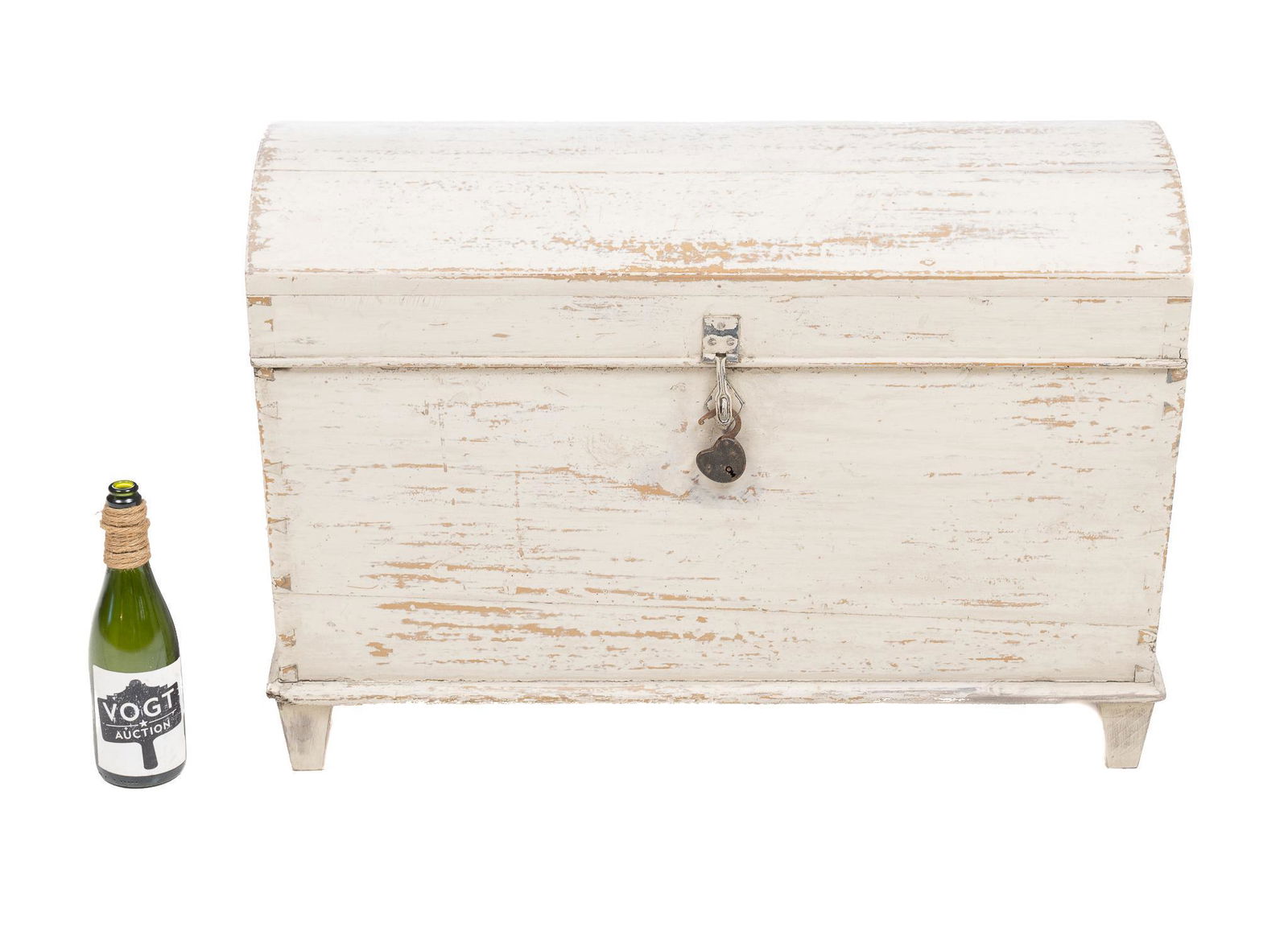 SoldFarmhouse Style ChestFarmhouse style chest, having rounded hinge top leading to interior storage, featuring distressed paint, signed 23"h x 34"w x 17"d We happily provide seamless shipping services on everytSee Sold Price