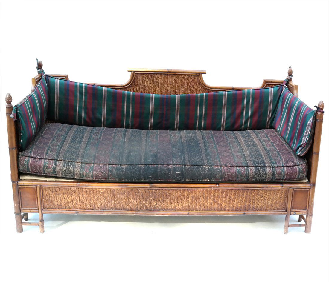 SoldFICKS REED FAUX BAMBOO & RATTAN SOFAWith three loose cushions, labeled h. 30 w. 82 d. 31 in. Provenance: Descended through a prominent Greenwich, CT family [In Situ Item] This item will not be on display in our saleroom during our previSee Sold Price