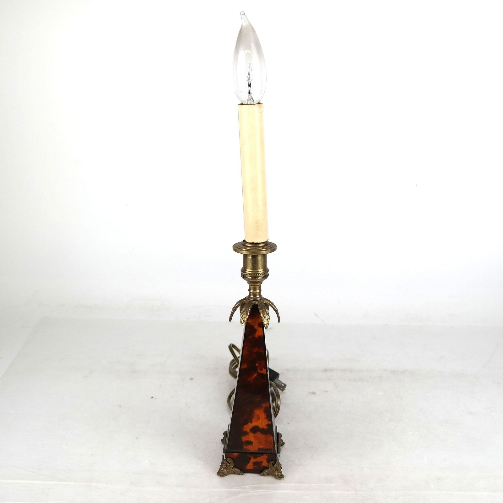 SoldFaux Tortoise Stick Table LampFaux tortoise candlestick lamp on bronze feet. Provenance: From the estate of a prominent NYC interior decorator. [15" H x 2 1/4" W x 2 1/4" D]. In good condition; not tested.See Sold Price