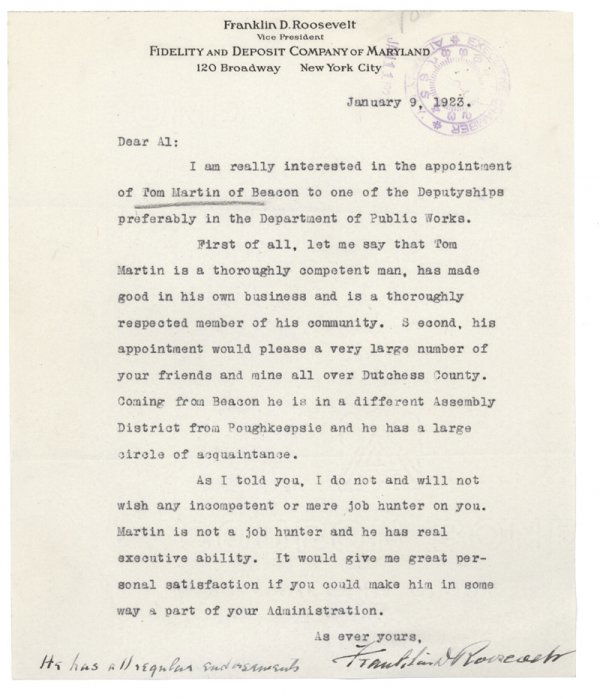 FDR SEEKS AN APPOINTMENT FOR AN ASSOCIATE
