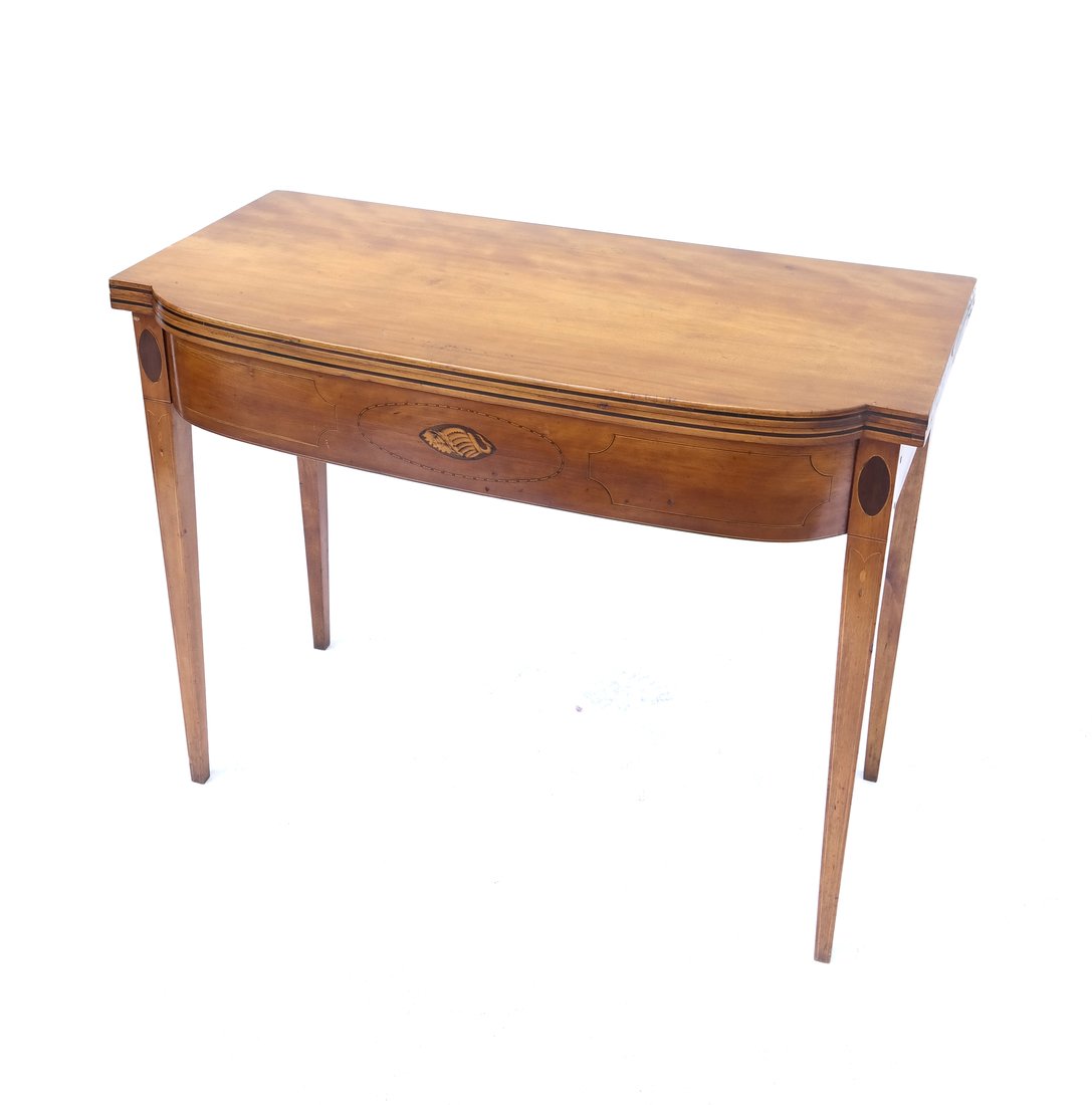 SoldAmerican Federal Inlaid Cherry Games TableAmerican Federal Inlaid Cherry Games Table, ca. 1800, New England, in the Hepplewhite taste, the gently bowed fold-over top supported by a fly leg, the conforming frieze with inlaid figural mahogany pSee Sold Price