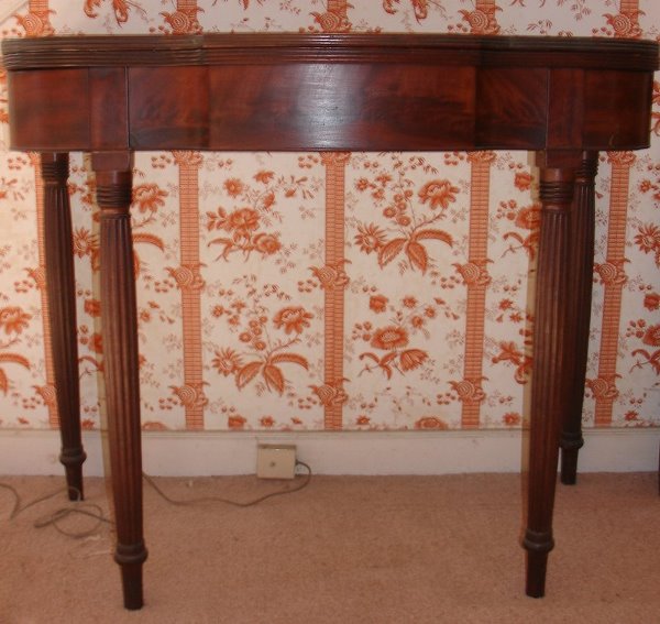 SoldAmerican Federal Games TableA 19th century American Federal games table. Mahogany construction with contrasting inlaid detail and Satinwood banding, demi-lune form with a hinged top which opens to reveal a felted playing surfaceSee Sold Price