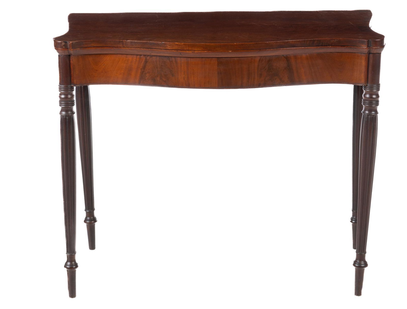 SoldFederal Style Card TableFederal Style card table, having console hinge top, unfolding to full size rectangular table, supported on fluted legs height 29.5 in. x width 35 in. depth 18 in. / opens to height 29 in. x width 25See Sold Price
