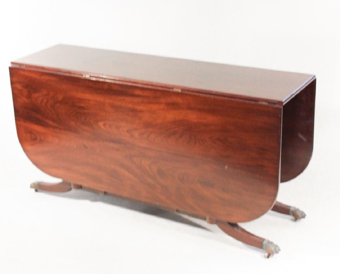 SoldFEDERAL STYLE MAHOGANY DROP LEAF TABLEFEDERAL STYLE MAHOGANY DROP LEAF TABLE, H 29", W 22", D 48"Having a single drawer at one end, a pedestal with four legs, two drop leaves (L 17"). Paw feet.See Sold Price