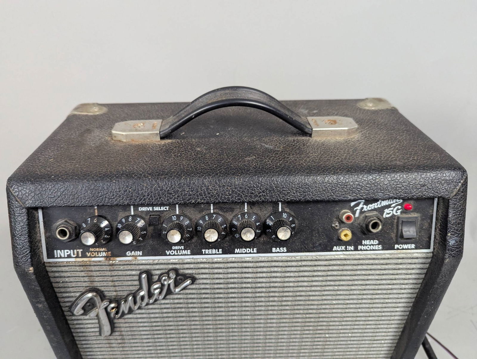 SoldFENDER FRONTMAN 15 G Guitar AmpAmp is trademarked FENDER FRONTMAN 15G. Piece has input, normal volume knob, gain knob, drive volume knob, treble knob, middle knob, bass knob, aux in, head phone jack & power switch. Piece measures aSee Sold Price