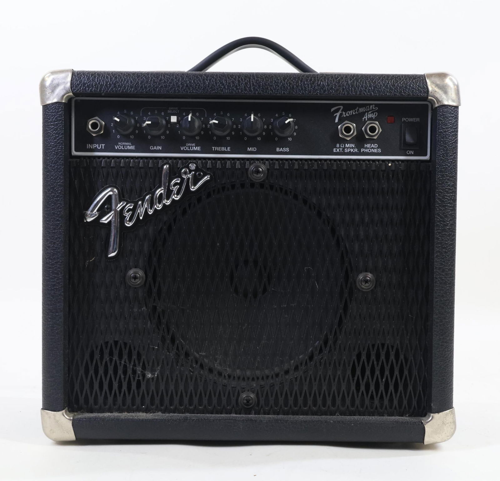 SoldFENDER FRONTMAN 15 G Guitar AmpAmp is trademarked FENDER FRONTMAN 15G. Piece has input, normal volume knob, gain knob, drive volume knob, treble knob, middle knob, bass knob, aux in, head phone jack & power switch. Piece measures aSee Sold Price