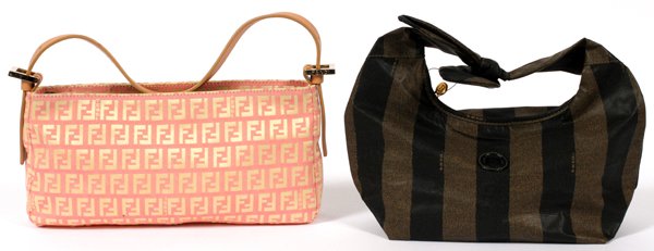 SoldThree Fendi Zucca HandbagsItaly, each in monogram canvas with leather handles and accents, comprising: handle bag, 8-3/4 x 12 x 5 in., handle drop 3-3/4 in.; baguette shoulder bag, 6-1/2 x 10-3/4 x 3-1/2 in., strap drop 7-3/4See Sold Price