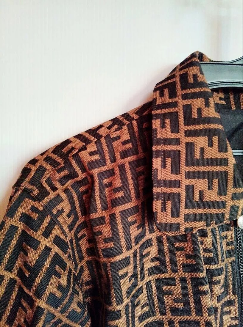 SoldHERMES Reversible Silk Bomber JacketA vintage Hermes silk bomber jacket, reversible to solid brown, size L. [50" chest, 25" from shoulder to waist]. Light pilling to knit cuffs and waistband; 5 tiny white spots (1/16") to left front. OnSee Sold Price