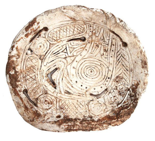 Fenestrated Shell Rattlesnake Gorget. Ex-Beutell