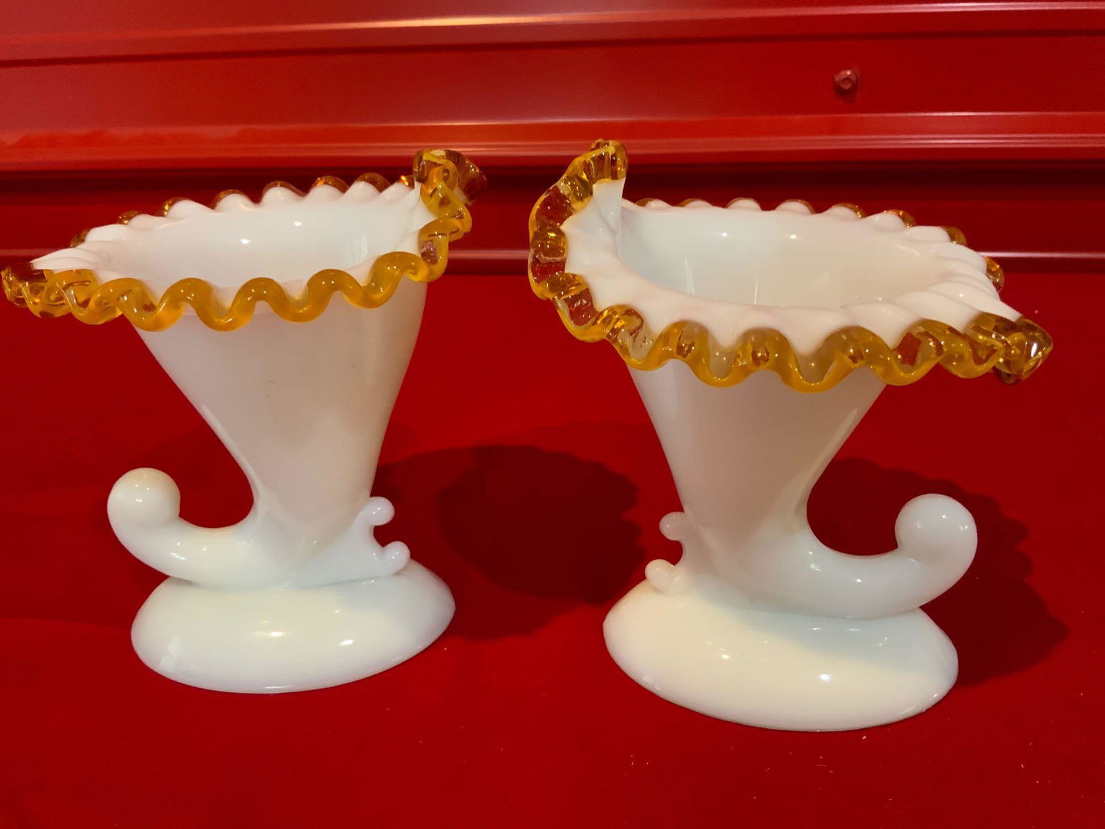 SoldVintage Set Fenton Gold Crest Petticoat GlassVintage Set Fenton Gold Crest or Amber Crest Petticoat Glass Cornucopia or Horn of Plenty Milk Glass Vases and a Fenton Silver Crest Footed or Pedestal BowlSee Sold Price