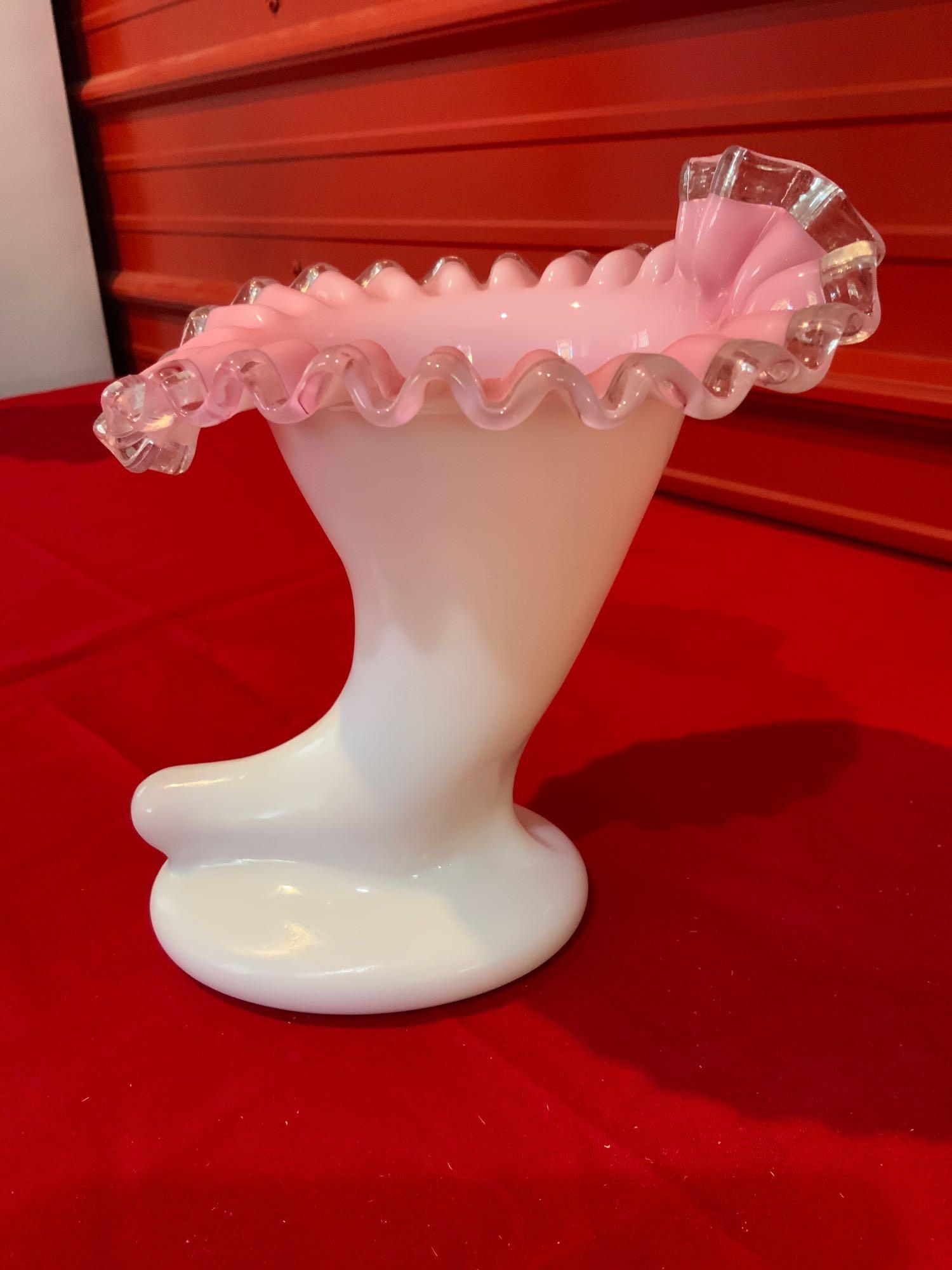 SoldFenton Pink Crimped Milk Glass Silver Crest VaseWhite exterior with pink glass interior. Edge has clear silver crimped edge. Lovely! Issued: 20th century Dimensions: 6.5"H x 7" dia. Manufacturer: Fenton Country of Origin: United StatesSee Sold Price