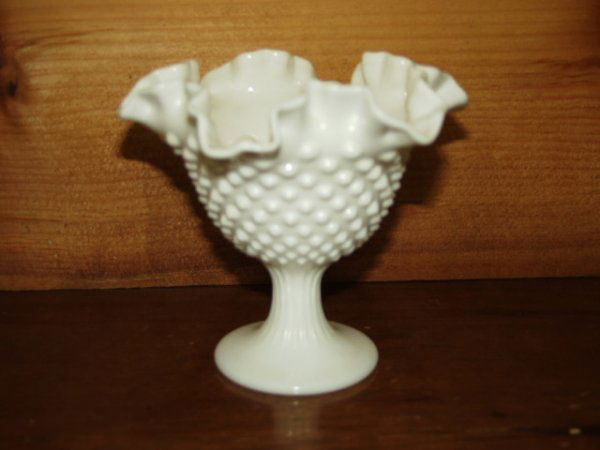 SoldFenton Art Glass Milk Glass Hobnail Ruffled Compote BowlClassic Fenton Art Glass footed compote bowl in great condition showing no noticeable damage or repairs. This design is from 1959 and has since been discontinued. It is 3 3/4” inches tall and 8&See Sold Price