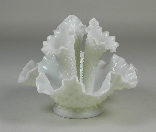 SoldFenton Epergne Diamond Lace HobnailFenton Epergne With Ruffle 3 Horn Trumpet White Milk Glassn Ruffled Crimped Dish Is Approx 10 1/4" Across Rim ~ 4 1/2" Across Base ~ Approx 3 1/2" High, 3 Horns - All Approx 8 1/2" Long At Longest PoiSee Sold Price