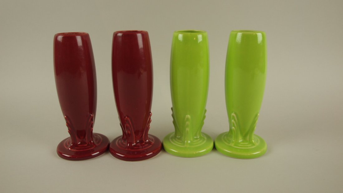 Fiesta Post 86 bud vase group, 2 cinnabar, 2 chartreuse