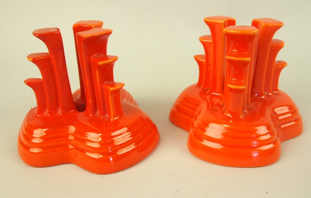 Fiesta tripod candle holders, pair, red, (one repaired)