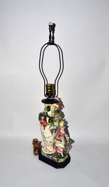 SoldFIGURAL CERAMIC TABLE LAMP with CHERUBS & LILACS26 1/2 inches to top of finial.. Condition: Minor losses to some of the appliqueSee Sold Price