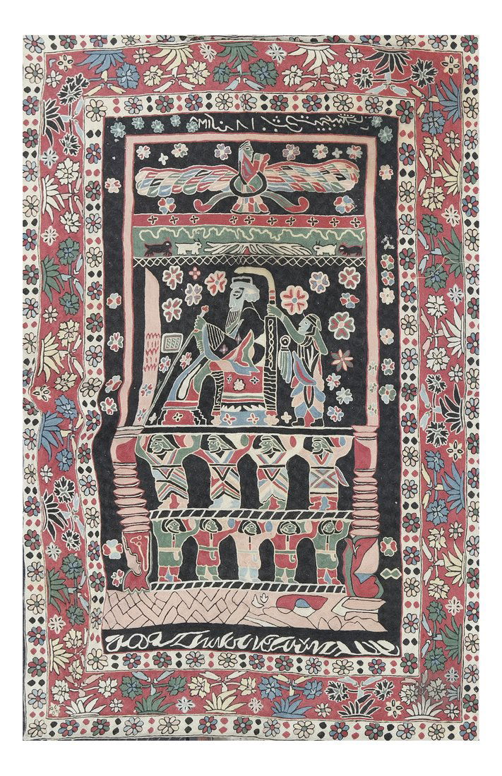 Sold19TH C PERSIAN RASHTI DUZI HAND EMBROIDERED TEXTILEAn antique Persian hand embroidered textile wall hanging. The ware is adorned with a hand embroidered symmetrical composition with a figural medallion to the center decorated and surrounded by floral,See Sold Price