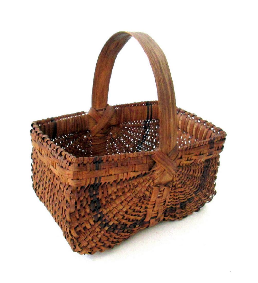 SoldEarly Gathering BasketEarly Gathering Basket Mid 19thC Black Ash 14"H X 14"W X 13 3/4"D Fine dark untouched dry natural patina, no breaks, cracks or losses. Wrapped rim, carved handle, kicked-up bottom. Please note that thSee Sold Price