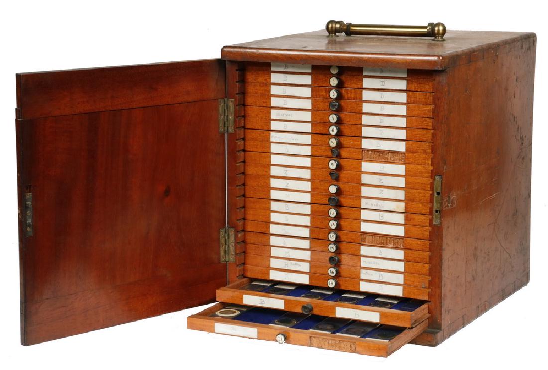 SoldA Cabinet of Microscope Slides,A Cabinet of Microscope Slides, A Cabinet of Microscope Slides, 19th Century, constructed of French polished mahogany on plinth base, arched glazed door to front with lock and key, campaign style handSee Sold Price