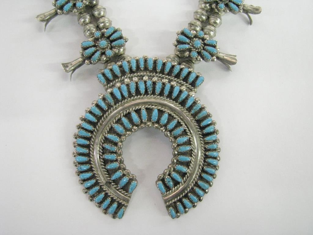 SoldZuni Sleeping Beauty Turquoise Needlepoint Squash Blossom NecklaceSterling Silver | Genuine Sleeping Beauty Turquoise | Zuni Sleeping Beauty Turquoise Needlepoint Squash Blossom Necklace | Zuni Native American Southwest Indian Jewelry | Good (no breaks or damages) |See Sold Price