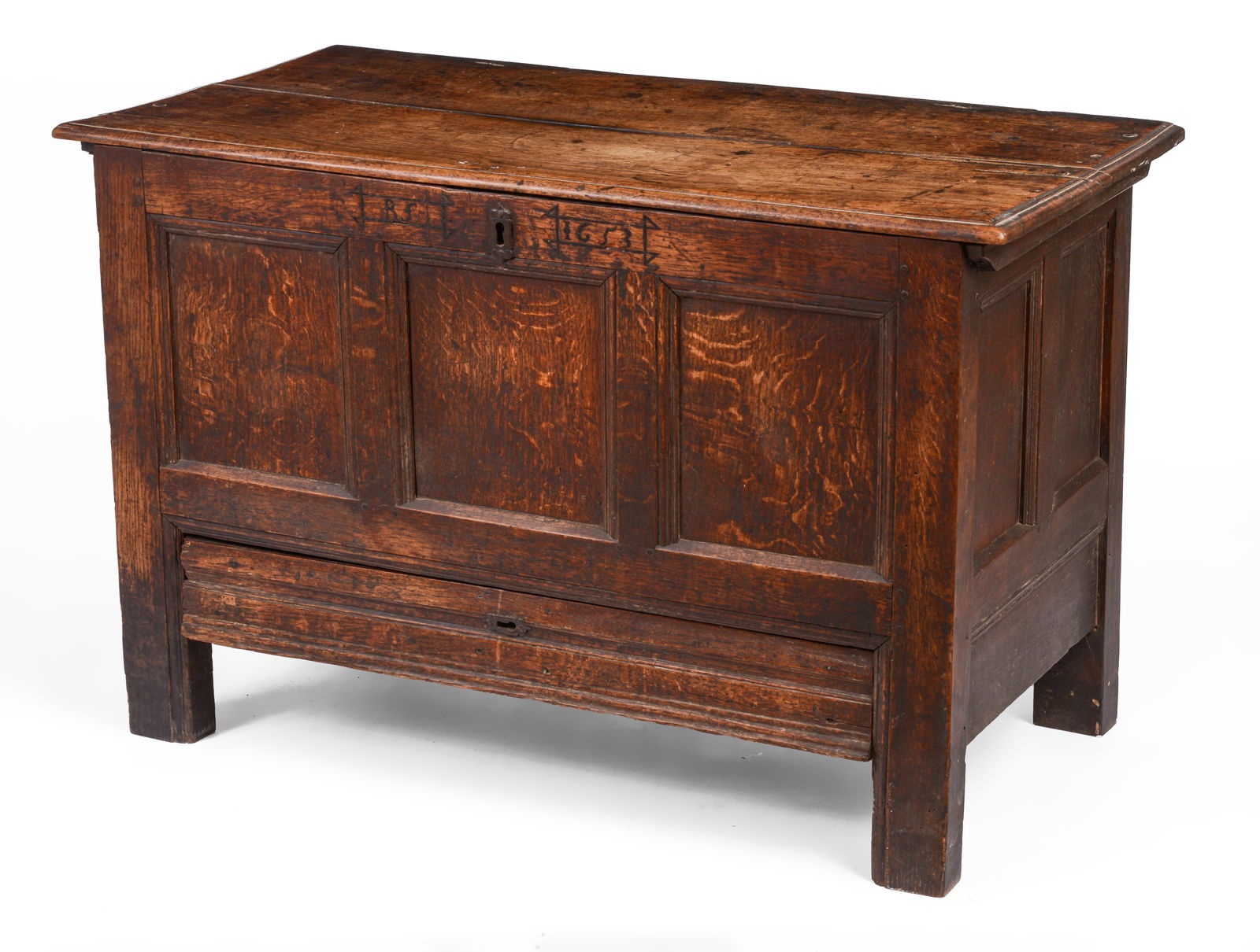 FINE OAK PANELED COFFER WITH ONE DRAWER,