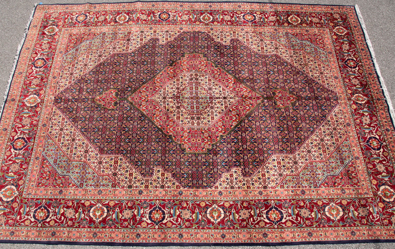 SoldPersian Carpet Tabriz 13'4" x 9'5"Fine Persian Tabriz Carpet, wool on cotton foundation, with intricate design and wide borders. Subtle colors of salmon, pink, light blue, lavender, green, blues and plum. Designed after a Persian tileSee Sold Price