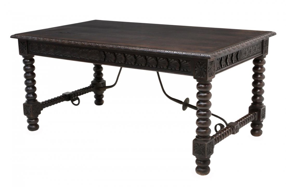 SoldSpanish Colonial Carved Walnut Library TableSpanish Colonial Carved Walnut Library Table. The top with gadrooned edge, held by scrolled supports with foliate carvings, iron stretcher. 18th century. {Approximate dimensions: 29 1/2" high x 50" wiSee Sold Price
